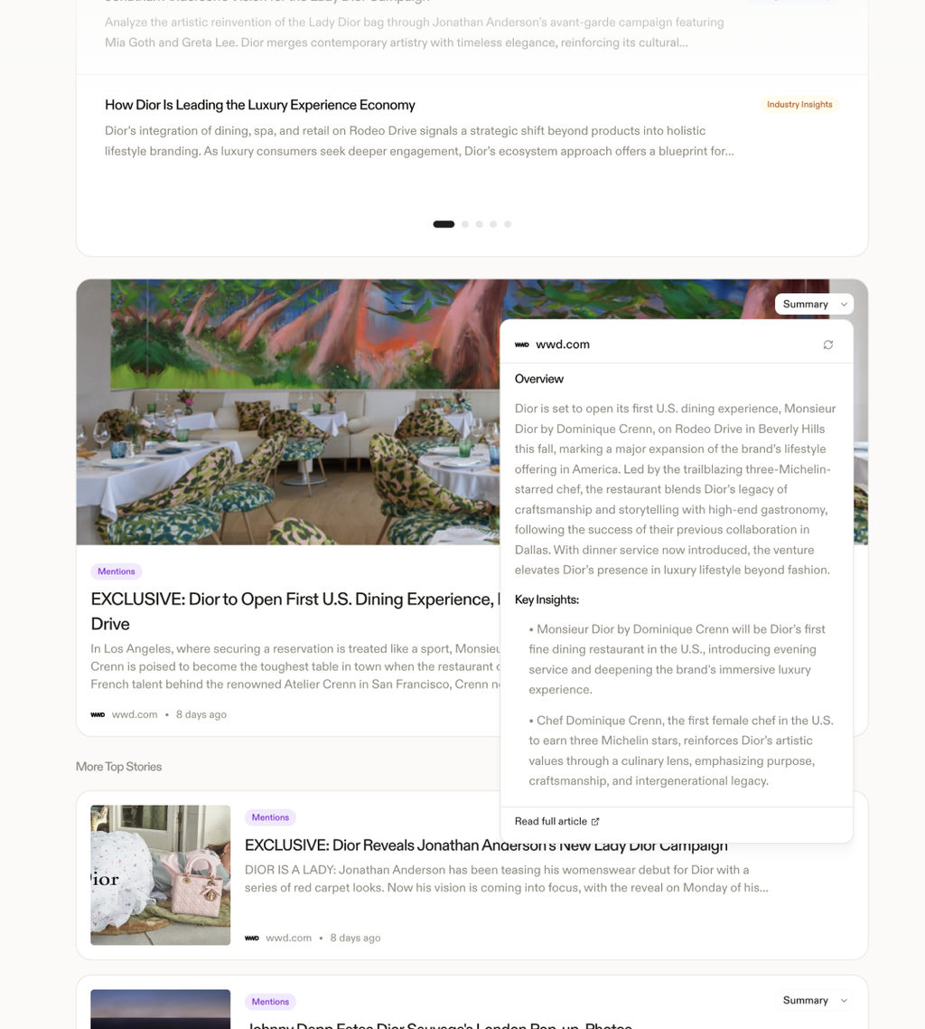 - Cultural intelligence: Brands exist in motion, not isolation. The OS continuously scans cultural signals and market shifts, surfacing the ones that are relevant to your brand. It helps teams anticipate opportunities and flag risks before they become costly mistakes.